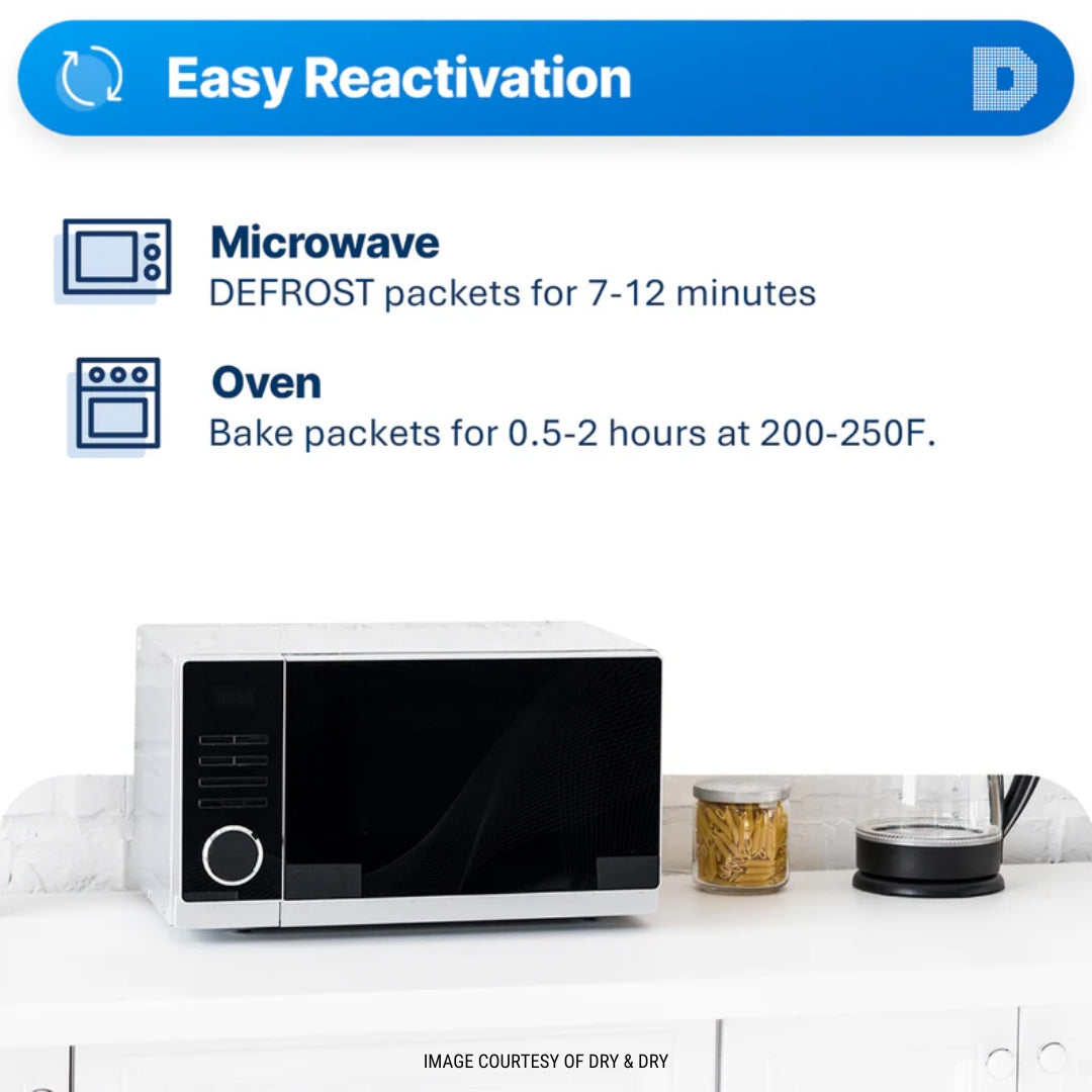 These packets can be recharged in a microwave or conventional oven. This means they can be continuously redried and reused. For detailed recharging instructions click here.